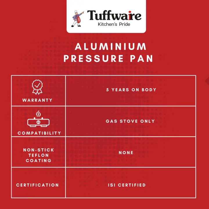 Tuffware Pressure Pan is ideally designed to provide 100 percent cooking satisfaction for Deep Steam cooking & for making popular dishes like Biryani & Pulav etc….